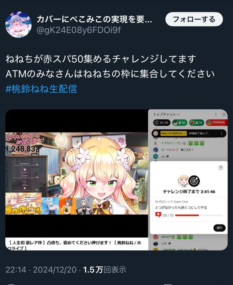 ホロライブ所属の桃鈴ねねさんが行った赤スパ50件耐久配信が、視聴者の間で話題になっています。一部では「これが古事記じゃなきゃなんなんだ」「結局お金か」といった批判的な意見も見られましたが、「ねねち可愛い」「125万人おめでとう」といった祝福や応援の声も多数寄せられています。配信の形式に対する疑問やYouTubeの新機能に対する驚きの声も上がり、賛否両論の展開となっています。ねねさんの人気と影響力の大きさが改めて注目される配信となりました。